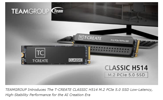 Компанія Team Group Inc. представила твердотільний накопичувач T-CREATE CLASSIC H514 M.2 PCIe 5.0, щоб задовольнити попит на зберігання даних в епоху генеративного штучного інтелекту.Побудований на основі інтерфейсу PCIe Gen5 x4, SSD забезпечує швидкість читання до 14 200 МБ/с і запису 13 300 МБ/с.Передача даних підтримує доступ до великих творчих активів і робочих навантажень, таких як редагування відео, обробка зображень, візуальні ефекти та 3D-моделювання.Він також підтримує робочі процеси для створення локальної моделі ШІ та навчання.